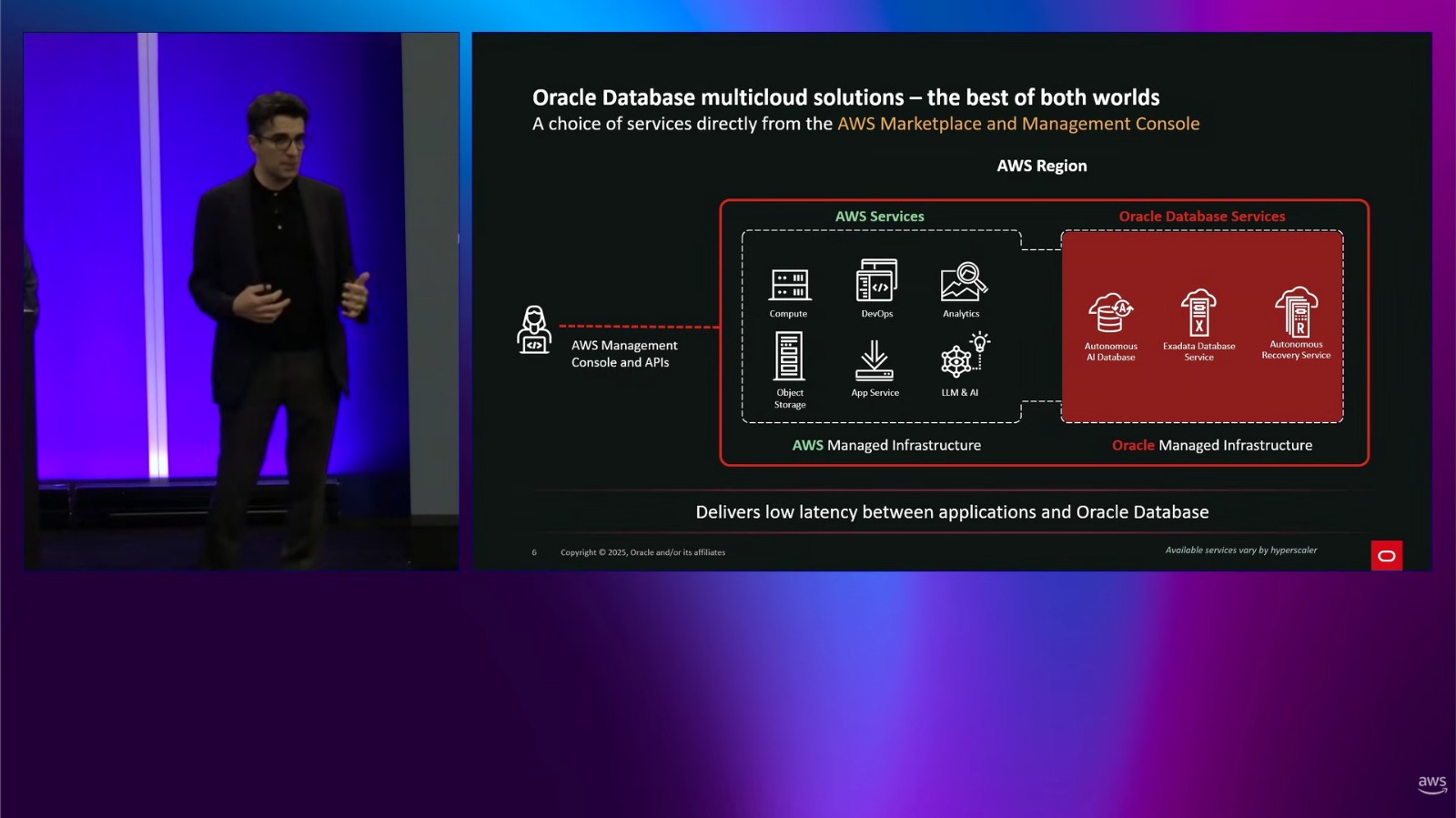 AWS re:Invent 2025 session covering Oracle Exadata deployment in AWS data centers for multicloud database solutions.